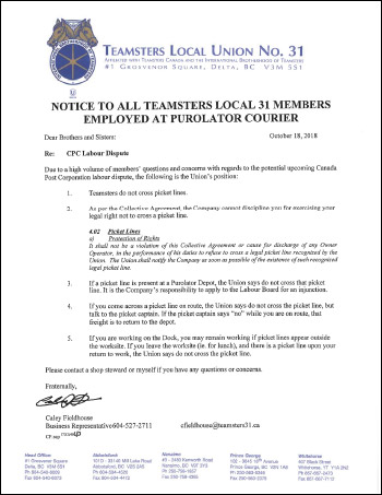 - Attention To All Teamsters of Impending Canada Post Labour Dispute