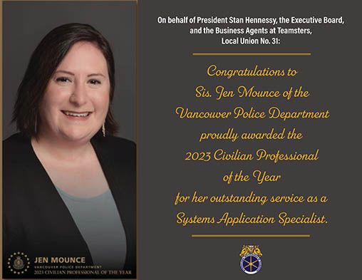 - Teamsters Member Jen Mounce Awarded 2023 Civilian Professional of the Year at Vancouver Police Department